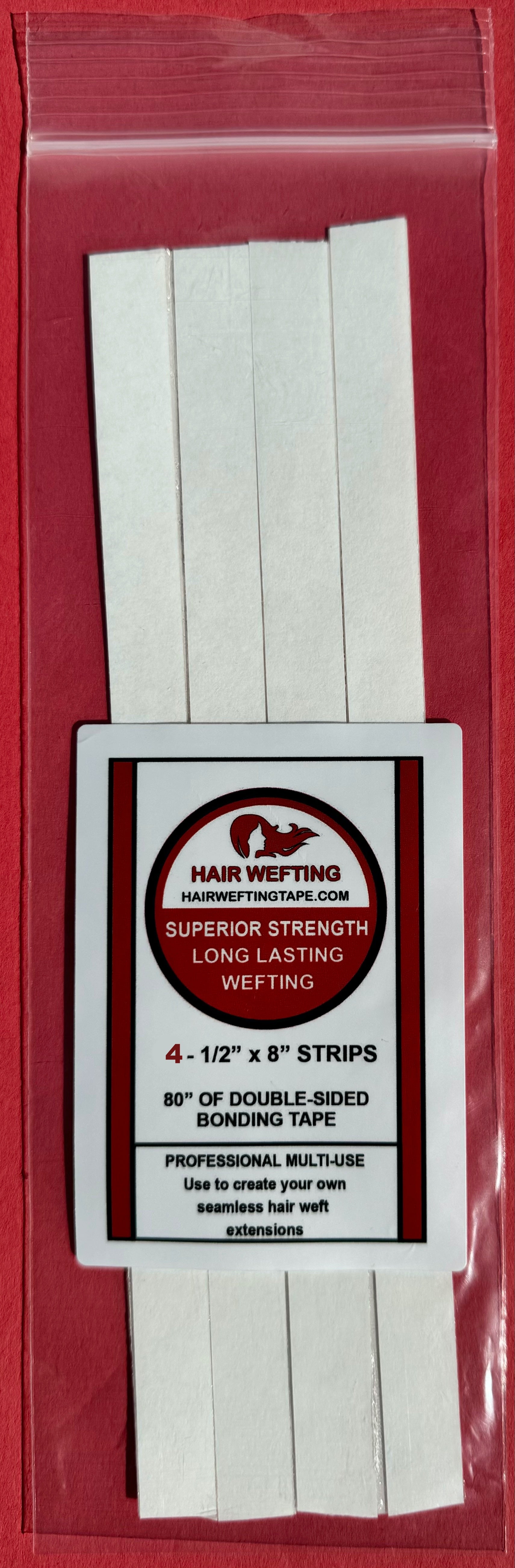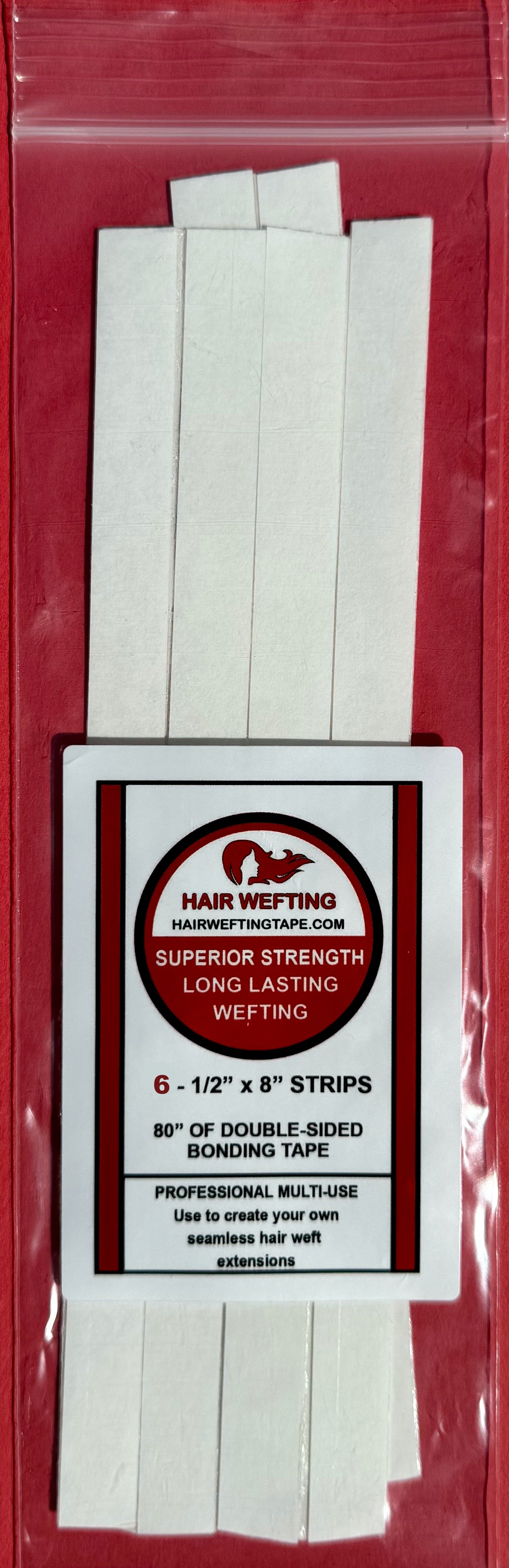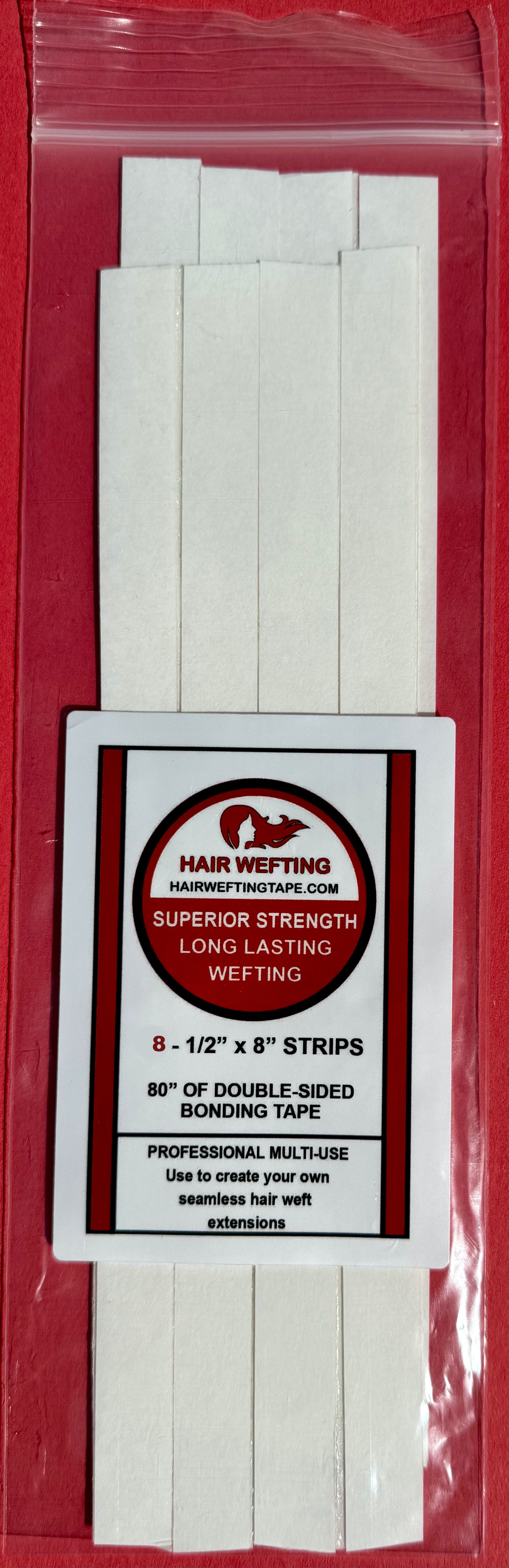 Our custom-made Hair Wefting Tape Strips are the strongest seamless hair extension tape on the market, with superior strength and a length of 1/2" x 8". Each pack contains 10 strips, Based on customer feedback, we have improved our tape from rolls to strips to lay flat without any curling.